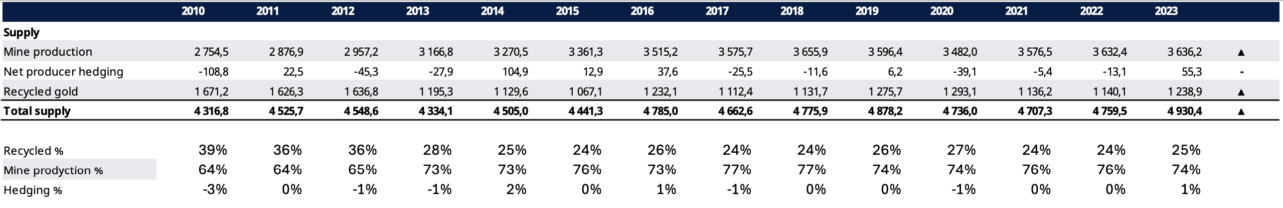 Enligt World Gold Council har tillgången på guld ökat från 4316 ton år 2010 till 4930 ton år 2023. Trots denna ökning finns det fortfarande betydande skillnader mellan mängden utvunnet och återvunnet guld, vilket påverkar marknaden på olika sätt över tid.